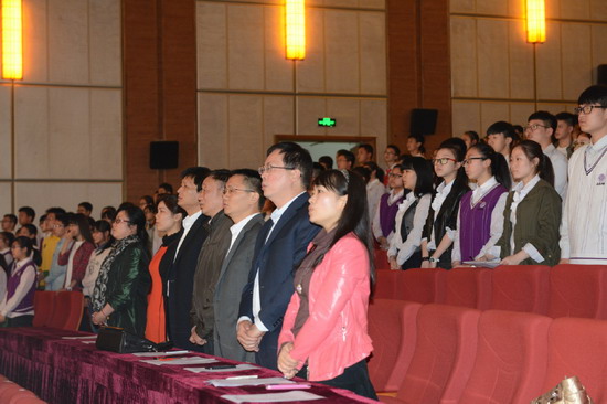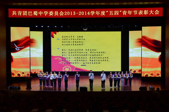(巴蜀网 李林 文一普 胡婉青)5月4日下午,由校团委、学生会、少先队大队主办的巴蜀中学2013-2014年度“五四”青年节“奋斗的青春最美丽”表彰大会分别在本部和鲁能礼堂隆重举行。校领导王国华、张勇、吕之生、舒义海、吴国慧、汪红霞、付英,学生处副主任万宇,教务处副主任张升,国际部副主任郑琪,年级主任许靖、李准、李潇珂,校团委指导老师,全校的优秀团干、优秀团员、各优秀团支部代表和新团员共同出席了本次大会。