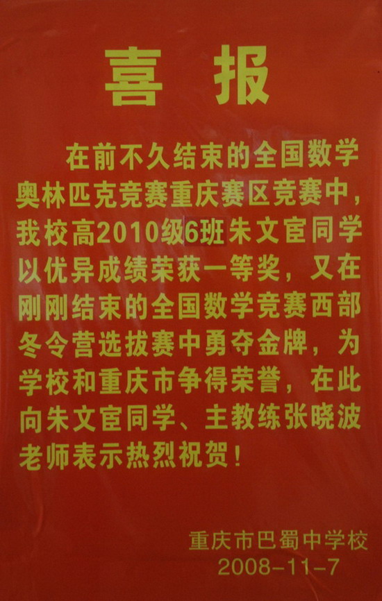 朱文宦同学获奥林匹克数学竞赛重庆一等奖
