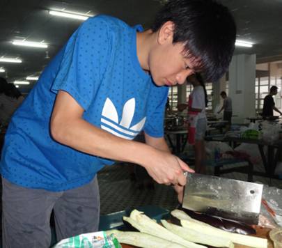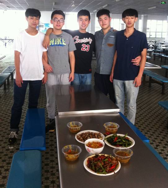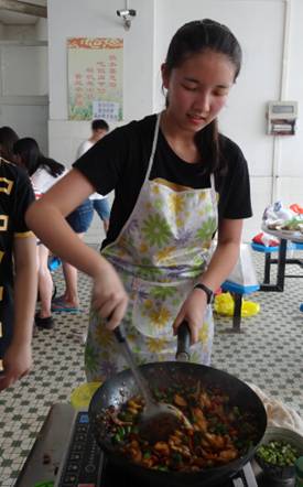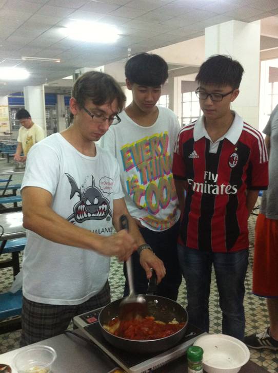 然后各组开始准备自己菜单上的美味佳肴,同学们各显身手,把全国各地的菜式都搬上了餐桌,具有本土风味的尖椒鸡,江浙风味的鸭蛋南瓜,酸甜可口的糖醋排骨,别有风味的可乐鸡翅,还有异国情调的爱情就像龙卷风(培根卷),甚至连国际部的外教Martin也忍不住露一手,给大家展示了拿手好菜---意大利肉酱面。
