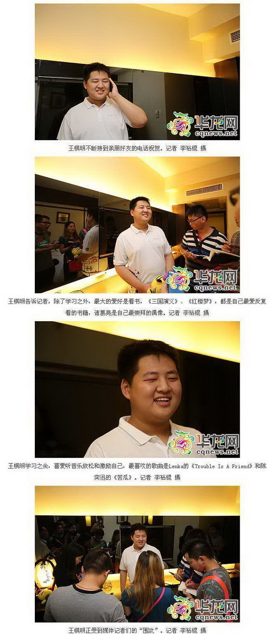 华龙网6月22日18时40分讯 (记者 庞可)因为爱吃零食,他高中体重猛涨几十斤;因为数学成绩太好,同学都称他为“来自应用题里的小明”……他,就是2014重庆高考理科第一名王棋明,总分689分,来自重庆巴蜀中学高三(48)班,是一个有些腼腆的“小胖娃儿”。