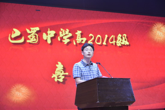 典礼在全体师生齐唱巴蜀校歌中开始。费春斌副校长作了高2014级工作汇报,他介绍了年级取得的辉煌成绩:我校考入北大清华人数居全市第一,王棋明同学勇夺重庆市加分、裸分双料理科状元,共467名学生上600分,1332名学生上重点大学线……他希望同学们继续努力,为中华之崛起而读书,成就自己的事业,为社会作出贡献。