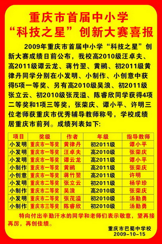 首届中小学“科技之星”创新大赛喜报