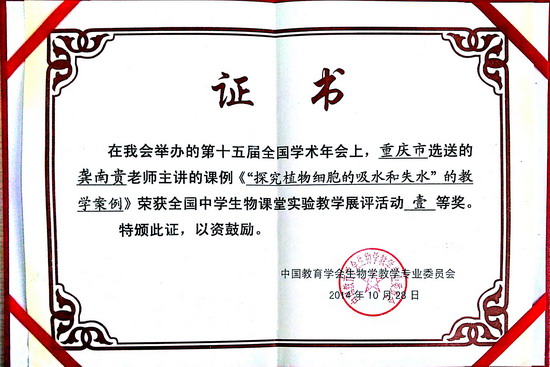 中国教育学会生物学教学专业委员会是生物教育学界最高级别最权威的学术组织。龚南贵老师一路过关斩将,先由学校推选至重庆市教育科学院,并成为教育科学院推荐到年会参赛的高中组两个名额之一,最后在全国众多的优秀课例中脱颖而出,摘获一等奖殊荣。
