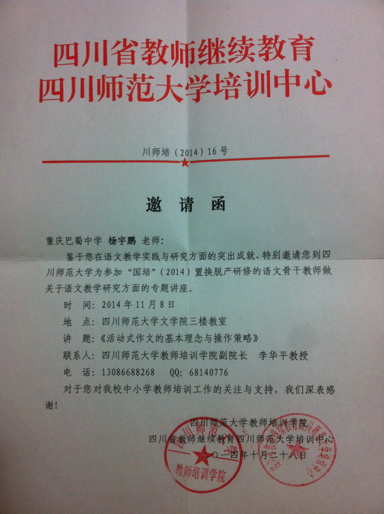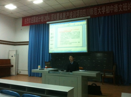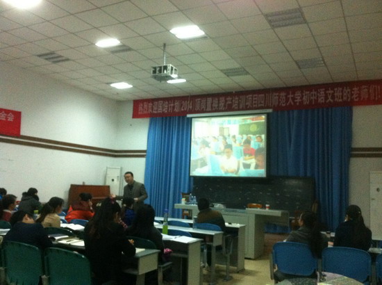 (巴蜀网 杨宇鹏)11月8日,语文教研室杨宇鹏、蒋嘉盛老师受四川师范大学教师培训学院、四川省教师继续教育四川师范大学培训中心的邀请,赴成都为四川省参加“国培”(2014)置换脱产研修的语文骨干教师做培训。