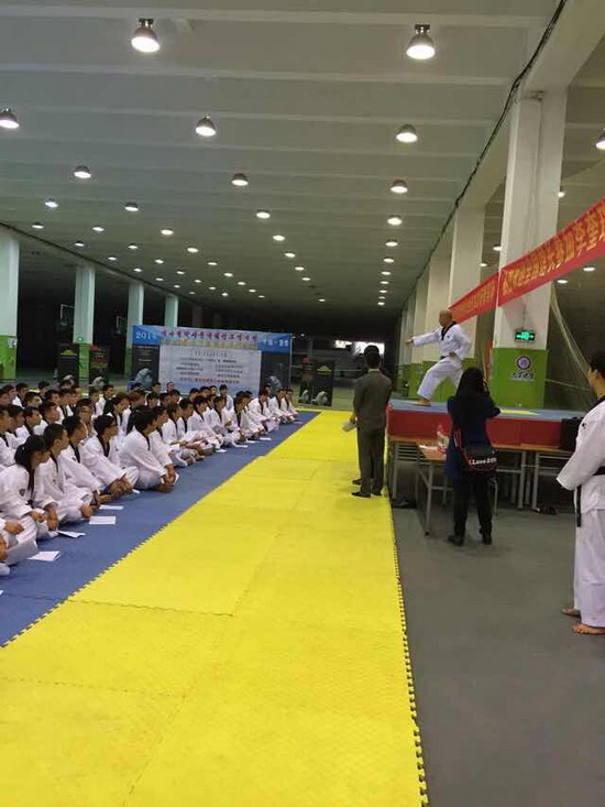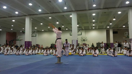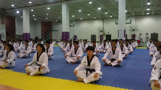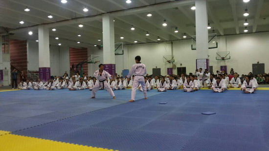 培训现场,72岁高龄的李奎珩博士以其严谨的教学态度和饱满的精神状态感染着在场的每一个人,无论是基本套路和动作要领,他都始终打着赤脚躬亲示范反复提示“顺着膝盖看,刚好能看到自己的脚趾头,这个弓步姿势就是最稳定的弓步。”虽然语言不通,但老人精气神十足,参与的学员观摩的学生都听得看得十分认真,唯恐缺漏每个细节。用李奎珩教授的话来说,跆拳道教授的不仅是技艺,更是传承一种文化,就是教做人的态度、交往的礼节 ,每一次交手都要敬礼握手,每一次失误都要向师长报告,每一个套路都要一丝不苟,这在培训的过程中体现的淋漓尽致。在最后一天下午的展示环节,来自韩国的另两位实战教练年轻的硕士更是演绎了跆拳道的真功夫,全体学员展示了富有韵律感的跆拳道搏击操,场面蔚为壮观,令观摩的师生大开眼界。