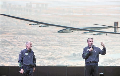 3月31日下午,顾不得一身的疲惫,执行此次环球飞行的两名飞行员贝特朗•皮卡尔、安德烈•波许博格及其他机组人员赶往重庆巴蜀中学鲁能校区参加“阳光动力科普中国行”活动,并在活动之后举行了一场新闻发布会,对人们好奇的问题进行分享。一句“你们好,下午好”的中文,虽然稍显蹩脚,却让现场的气氛立即活跃起来,也打开了两位飞行员的话匣子。