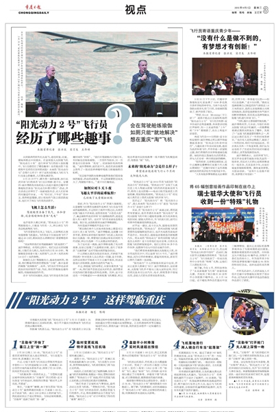 从阿联酋的阿布扎比起飞,途经阿曼、印度、缅甸再抵达中国重庆,在全球最大太阳能飞机“阳光动力2号”进行环球飞行的前5段航程中,飞行员都经历了哪些趣事?而在随后的7段航程中又将经历怎样的风险?未来的“阳光动力号”会是什么样子?对于这架太阳能大飞机与飞行员身上的趣事,人们都充满好奇。