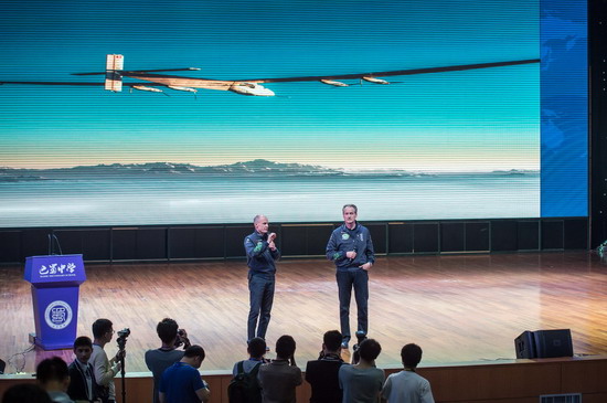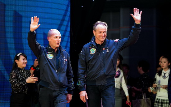 3月31日,“阳光动力”2号飞行员安德烈·博尔施伯格(右)与飞行员贝特朗·皮卡尔向在场学生挥手致意。新华社记者 刘潺 摄