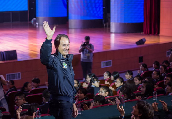 3月31日,“阳光动力”2号飞行员安德烈·博尔施伯格在活动现场向在场学生挥手致意。