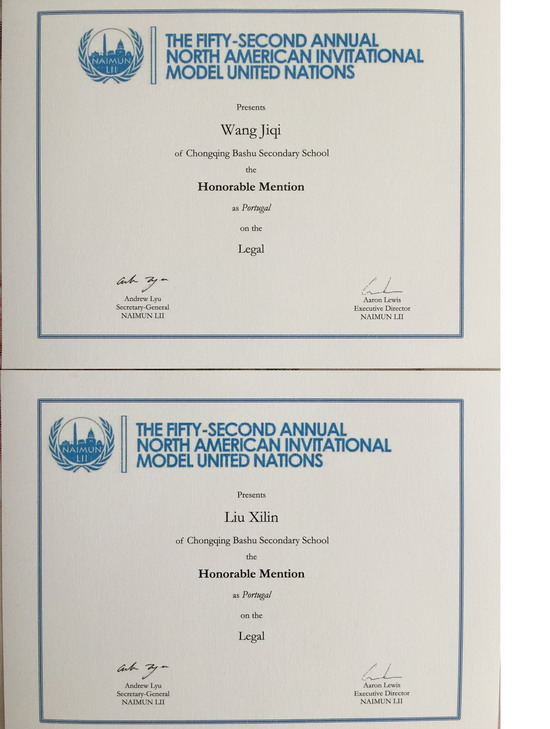 在所有同学,特别是模联社团老师的努力下,这次巴蜀模联团队取得了里程碑式的突破。我校的刘曦临和汪霁祺获得了主委会颁发的Honorable Mention奖项。