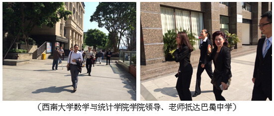 (巴蜀网 李嘉耕)2015年4月14日,西南大学数学与统计学院党委书记杨劲,党委副书记廖晓衡,数学系主任魏林,办公室主任叶晓娅,以及教学秘书胡钦瑞,辅导员魏小璐在巴蜀中学实习队带队老师、数学与统计学院副院长李忠如的陪同下,一起来到巴蜀中学看望2015年春季数学实习队实习生。