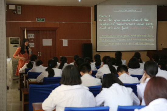 然后,我校张义老师献了Man and Pets--a Loving Bond。张老师的课充分展现了名校教师良好的专业素养,独特的教学风格,突出了教学过程的真实性、艺术性,达到了“人课合一”的境界。