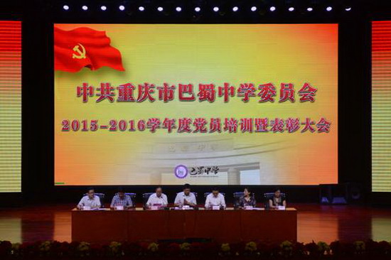 (巴蜀网 宋杰、曾静)为贯彻落实全面从严治党要求,巩固和拓展党的群众路线教育实践活动成果,更加深入持久的推动我校党的思想政治建设和作风建设,8月27日下午3点,“中共重庆市巴蜀中学委员会2015—2016学年度党员培训暨表彰大会”在巴蜀中学本部礼堂举行。巴蜀中学党委书记舒义海同志,巴蜀中学党委副书记王国华同志,巴蜀中学党委副书记吕之生同志等全体党委委员莅临大会,全校教职工党员共590余人参加了本次党员大会。