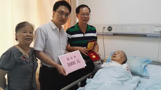 (巴蜀网 宋杰、曾静)今年是抗战胜利70周年,为体现党中央、国务院对老同志的关怀和照顾,根据中共重庆市委组织部、中共重庆市委老干部局、重庆市财政局转发《中共中央组织部、财政部关于为抗战时期及以前参加革命工作的离休干部发放一次性慰问金的通知》的文件精神,9月2日上午巴蜀中学党委副书记吕之生同志、巴蜀中学党委办公室副主任宋杰同志、巴蜀中学退教协刘承慧同志代表中共重庆市巴蜀中学委员会到重庆市中医院看望、慰问了抗战期间参加革命工作的离休干部姜淑章同志,为其送达中共中央、国务院、中央军委颁发的“中国人民抗日战争胜利70周年纪念章”并送去5000元慰问金,衷心感谢她为中国抗战事业,尤其是学校的发展做出的卓越贡献。