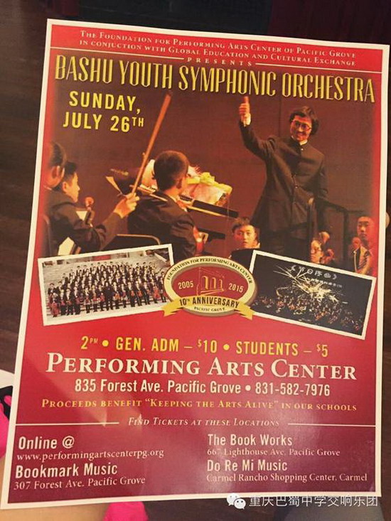 巴蜀中学交响乐团自成立起就一直是整个重庆中小学艺术团队的领头羊,重庆交响乐团周生宏担任常任指挥,汪红霞校助亲自抓,李颖、曾樱、李加一等音乐老师认真管理,近70位同学潜心训练,连续3年大剧院新年音乐会,连续三届全市艺术展演器乐一等奖,逐渐成熟,更加凝聚,如今酝酿三年,小巴交将代表中国重庆参加2015年7月22-8月1日的有着悠久历史的已举办78届的美国卡梅尔巴赫国际音乐节!本次音乐节上,乐团将以德沃夏克创作的《狂欢节序曲》,小提琴协奏曲《金色的炉台》以及重庆民歌改编的管弦乐曲《太阳出来喜洋洋》三支曲目参加音乐节的比赛。除此以外,乐团还将在卡梅尔举行两场专场演出,当地媒体及民众非常期待。