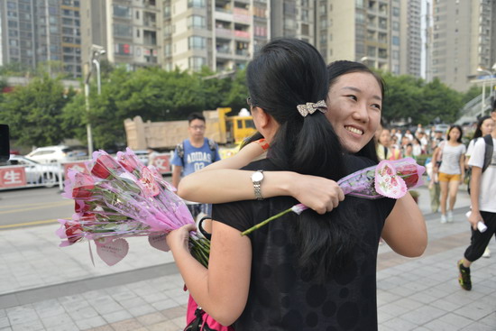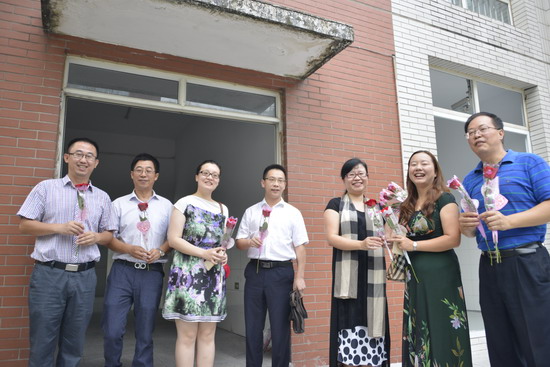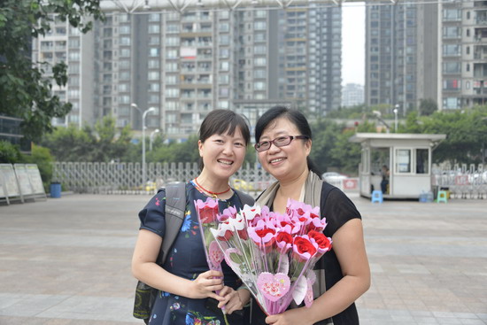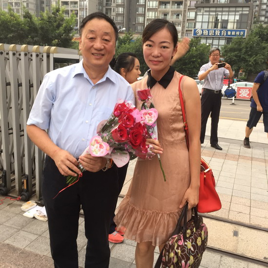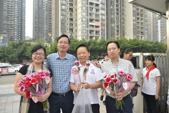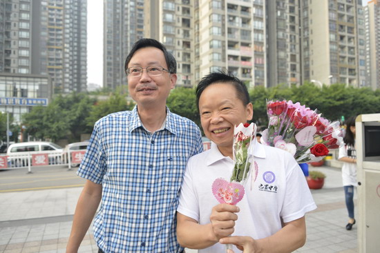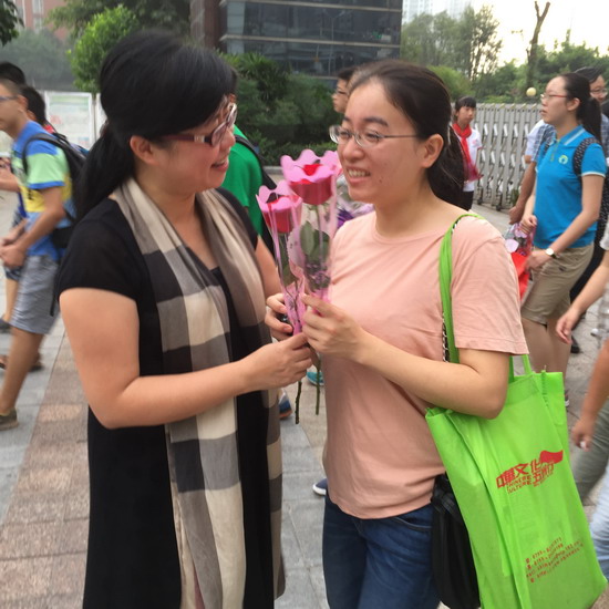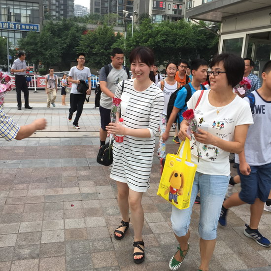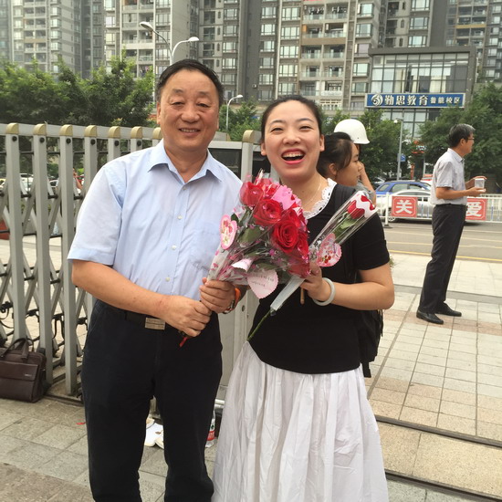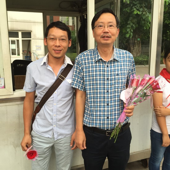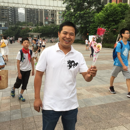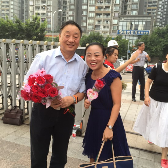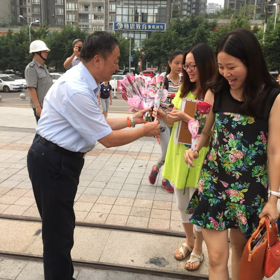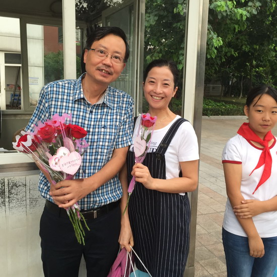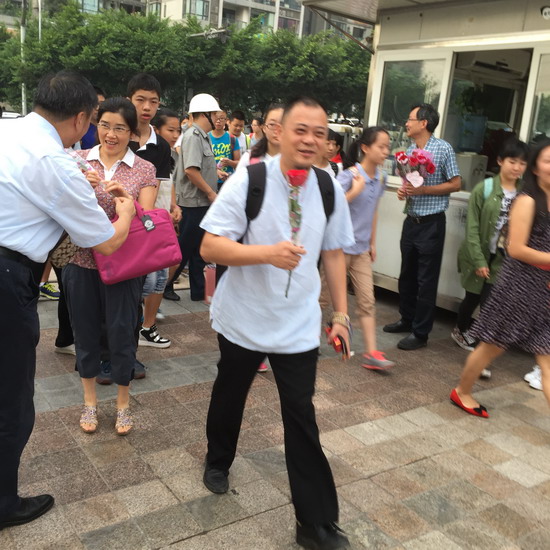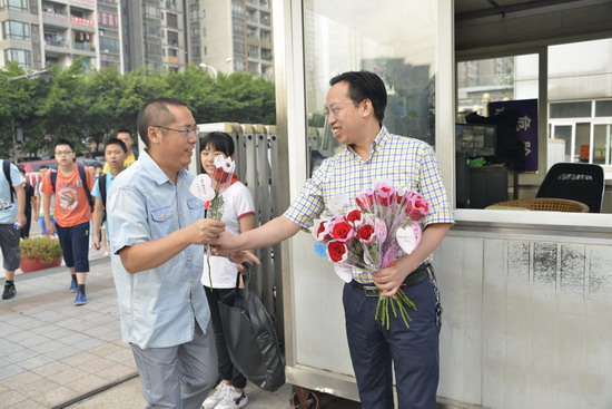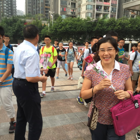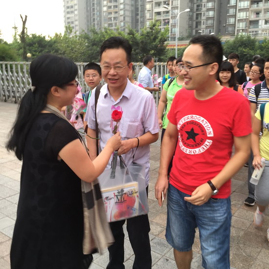 (巴蜀网 许吉 杨尚晶)2015年9月10日教师节,鲁能巴蜀校园充满着温情、洋溢着爱意。早上七点,鲁能巴蜀中学校长张勇,巴蜀中学党委副书记吕之生,巴蜀中学副校长、鲁能巴蜀中学执行校长吴国慧,鲁能巴蜀中学校长助理张勇、夏义勇、汤登建、杜明元早早地来到学校,在学校校门口、车库入口为到校老师们送上清晨的第一缕祝福,最鲜艳的一支玫瑰花。