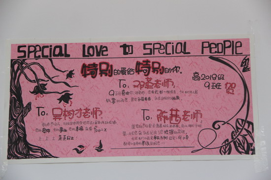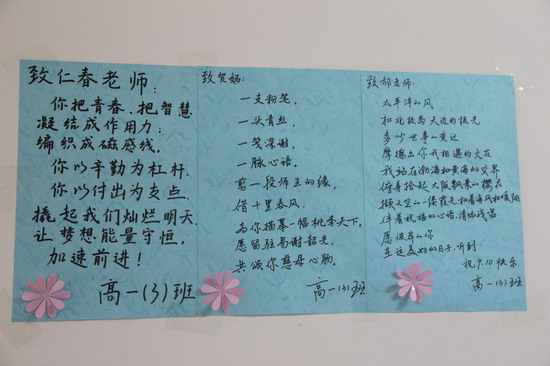 在这次活动中,各个班级的同学们都踊跃参与,各具特色。将他们对老师的喜爱、祝福、希冀化为涓涓文字。看,富有情书意味的 “有一才子,见之不忘;一日不见,思之如狂”的直白表达;将老师称作“贺妈”的温暖称呼;对老师“您像夜空中最亮的星,没有您的指引,我们只能在黑暗中摸索”的真诚感恩……无一不表现着学生们对老师的爱意和期待,在刚踏入巴蜀的高中阶段与身边的益友良师一起度过了一次情感与表达充满特色的教师节。无论他们用什么样的形式,都是对老师的敬爱和感谢。当办公室的墙壁装点满学生的祝福,每位老师的脸上都洋溢着会心的笑容和默默的感动。