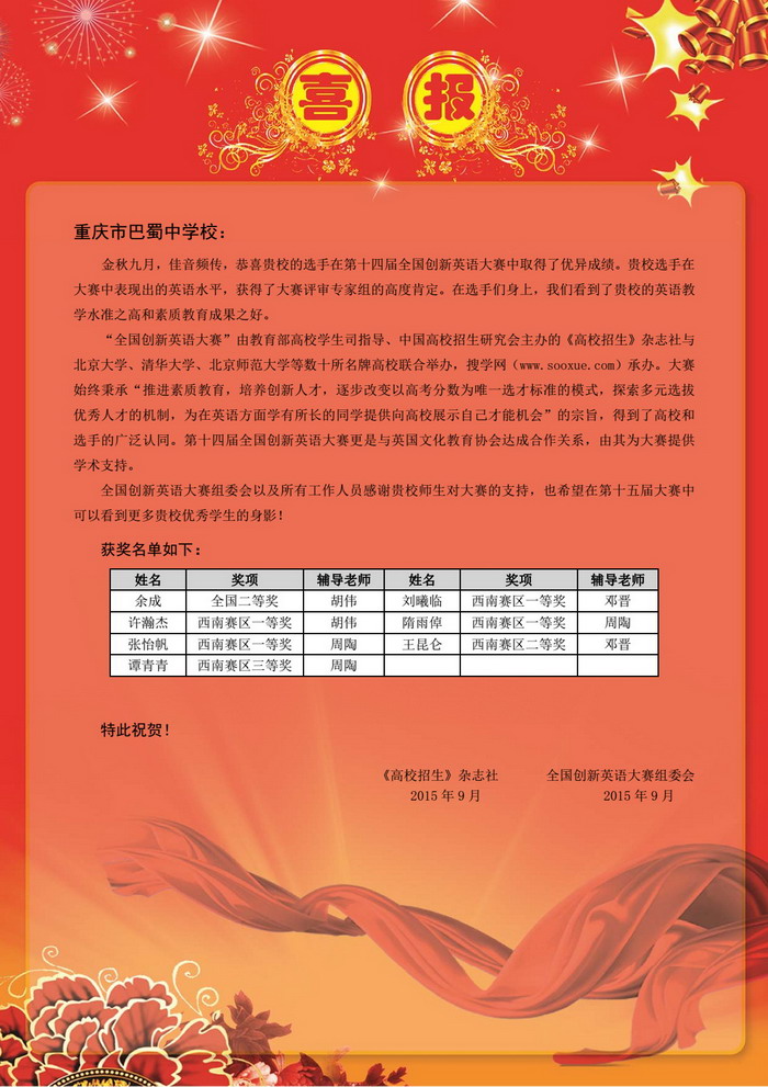 我校在全国创新英语大赛中获佳绩