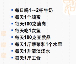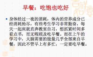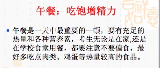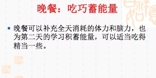 吃东西每个人情况不一样,需量体裁衣,全国提出平衡膳食宝塔,必须结合自己小孩的情况来进行设计,丰富多彩,种类多,三餐特别是高三学生除三餐之外还有加餐。