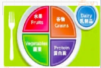 这个餐盘很直观:小盘子是乳制品,不可缺的牛奶、酸奶、以及奶制品,大盘子就是四个部分:水果蔬菜占半壁江山,谷类占1/4,,蛋白质主要指肉类,包括鸡蛋,畜禽,肉类整个只占1/4。