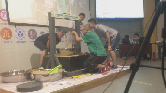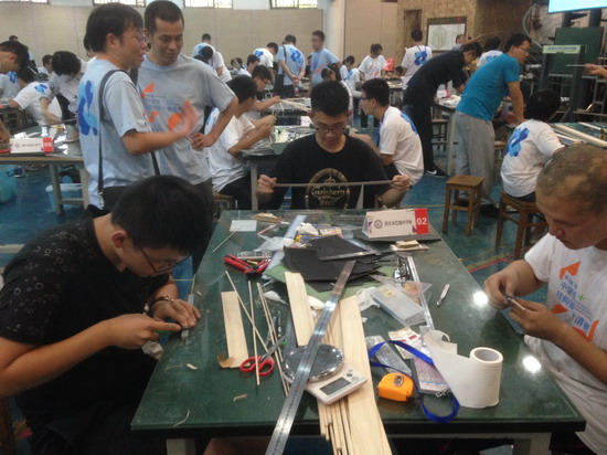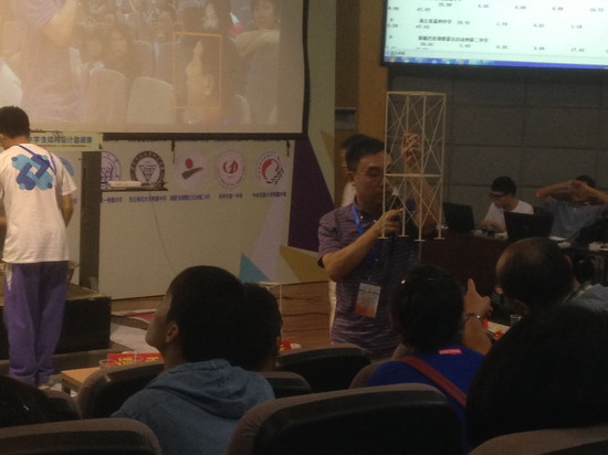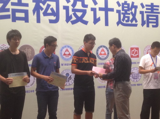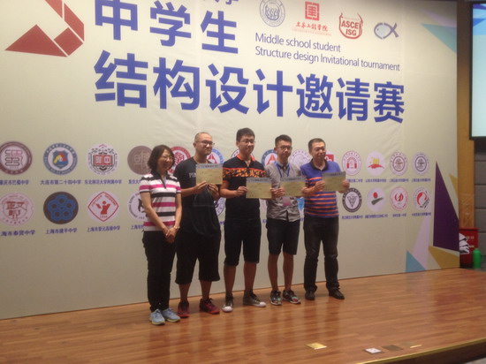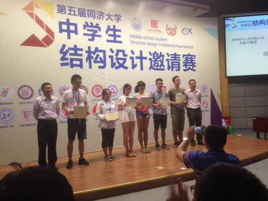 三天前,邀请赛在同济大学土木工程学院大学生创新实践基地拉开帷幕,来自全国25个省市32所知名高中的百名优秀学子(每队3人)齐集赛场,每队采用桐木和胶水,在规定时间内设计、制作出一件0.5米高的房屋结构模型,通过竖直荷载和水平荷载以及模拟地震的水平震动阻尼回复测定和水平位移残量测定等成绩评定,最终我校学生制作的模型以56.25的总分获得第一名。