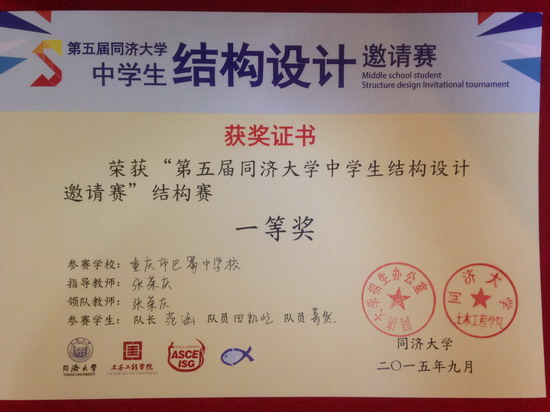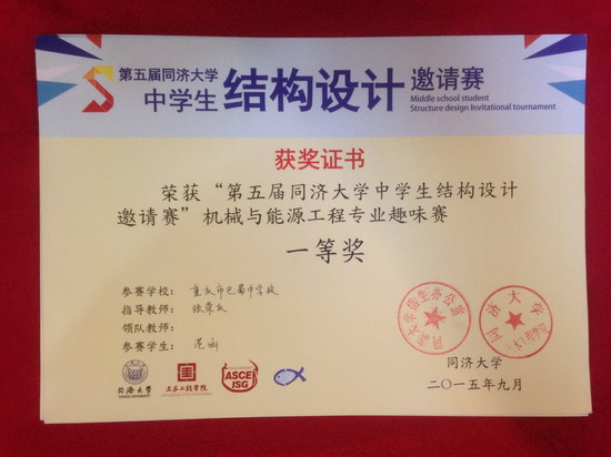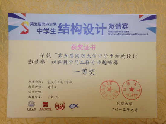 在刚刚落幕的第五届同济大学中学生结构设计邀请赛中,我校三名学生获得结构赛第一名,田凯屹获得材料科学与工程专业赛一等奖,范涵获得机械与能源科学专业赛一等奖,特此对付出辛勤努力的同学和指导老师张荣庆表示祝贺。