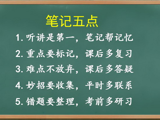 “笔记五点”是“听讲是第一,笔记帮记忆。重点要标记,课后多复习。难点不放弃,课后多答疑。 妙招要收集,平时多联系。 错题要整理,考前多研习。”它既说明了笔记的地位,又强调了笔记的方法。