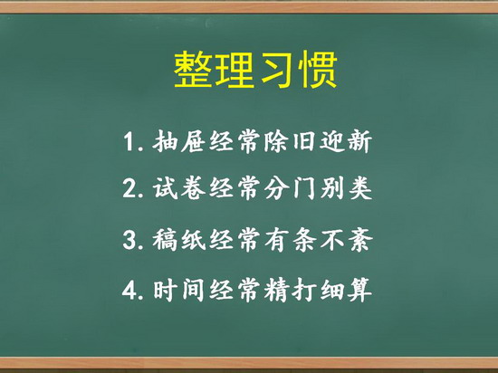 第四章是整理习惯。为引导学生高效地学习,我们提出了整理习惯的概念,即“抽屉经常除旧迎新,试卷经常分门别类,草稿经常有条不紊,时间经常精打细算”。
