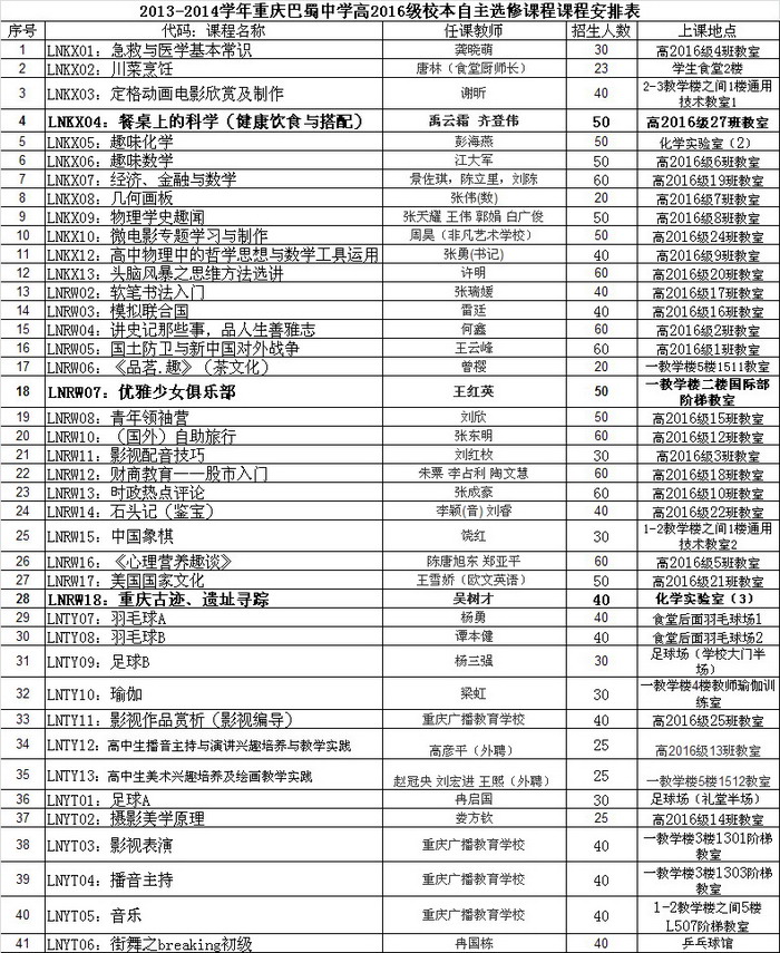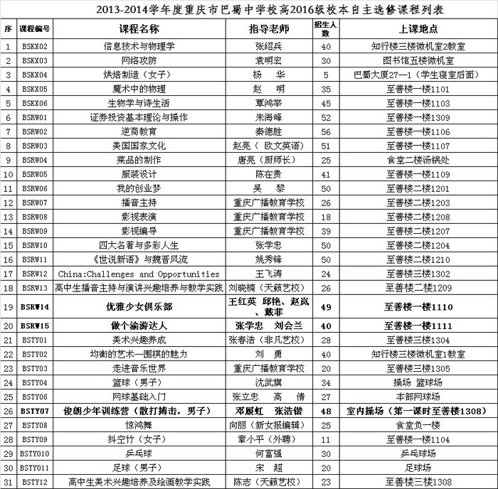 2013-2014学年巴蜀中学高2016级选修课程安排表