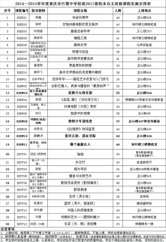 2014-2015学年巴蜀中学高2017级选修课程安排表