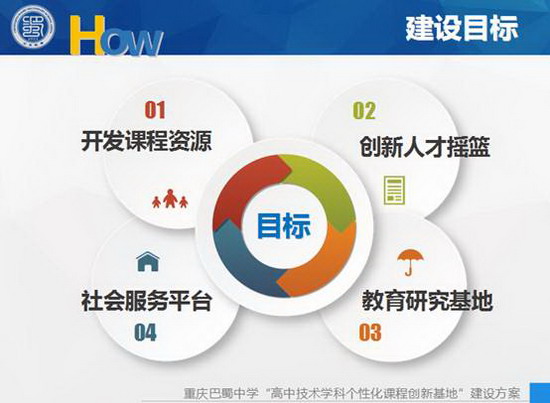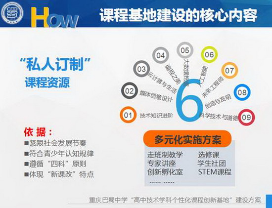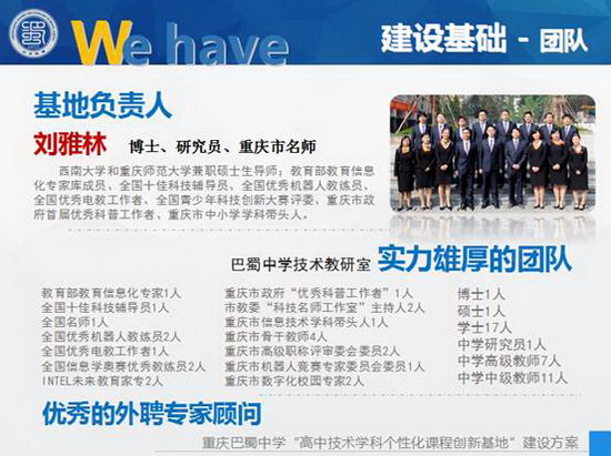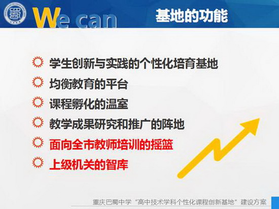 建设“重庆市普通高中技术课程创新基地”,既有利于优化学校课程育人功能,全面深化教学改革,又有利于提高学校办学质量,提升学校在全市乃至全国的知名度和影响力。