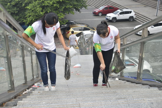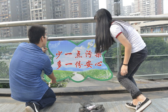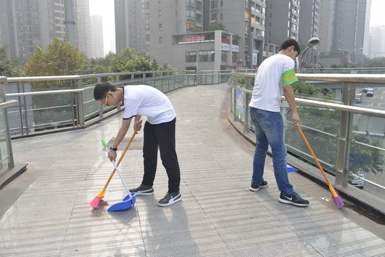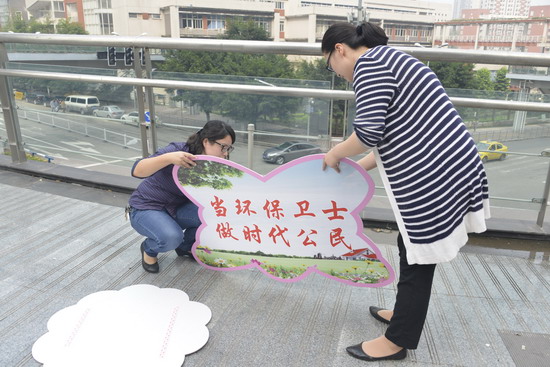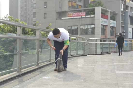 同学们每人拿着一把大铁剪子、一个黑色垃圾袋、一张抹布,不厌其烦地弯腰捡起一张又一张纸屑,将垃圾全部装进了自带的垃圾袋里,宽敞的水泥路面慢慢干净了,跳跃着孩子们青春的脚步。他们又用抹布擦亮了一块又一块满是灰尘的天桥玻璃护栏,护栏上的玻璃渐渐清透了,仿佛印下了蓝天的笑脸,更印出了孩子们看见自己的劳动成果后开心的笑容。在大家的辛勤劳动下,人行天桥终于恢复了原有的整洁容貌。最后,孩子们用双手将 “当环保卫士,做时代公民”、“少一点污染,多一份安心”、“地球是我家,环保靠大家”、“保护环境,从我做起” 这4个标语牌---贴在护栏上。他们深知高大的天桥的卫生环境需要人们来清理,也更需要大家一起来共同的维护,对于持续环保,美化社区来说,意识和行动,缺一不可。