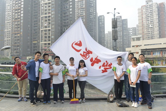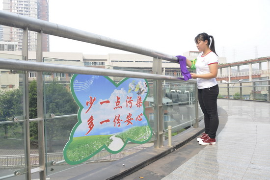 (巴蜀网 杨尚晶) 阳光明媚,秋高气爽。2015年10月19日下午,校门口的人行天桥上出现了一群身穿校服、肩配绿袖标“爱劳动”的学生。来自鲁能巴蜀中学高一年级的同学们今天的劳动课选在了位于校门外的人行天桥,他们用自己的双手为学校门口的人行天桥清理了所有垃圾并贴上环保标语。
