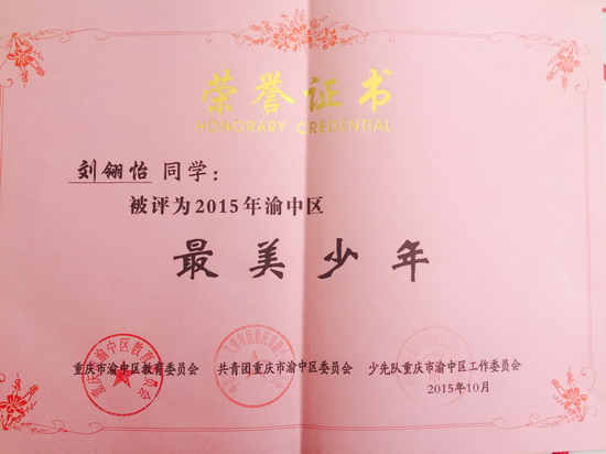 我校初2017级刘翎怡同学荣获2015年渝中区最美少年!