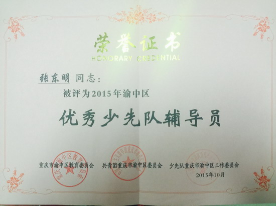我校少先队大队辅导员张东明老师荣获渝中区2015年优秀少先队辅导员!