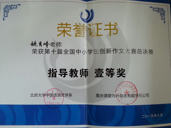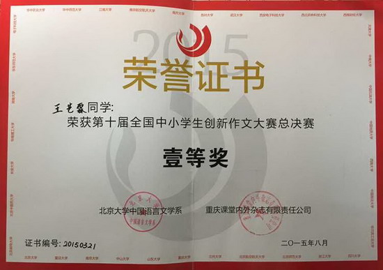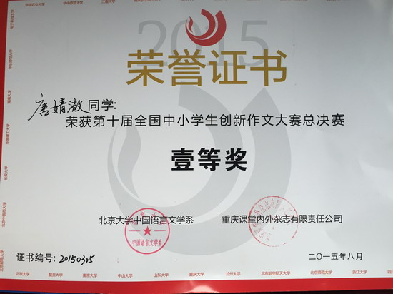 (巴蜀网 姚秀锋)经过重庆赛区、北京大学全国总决赛这两轮激烈的角逐,初2016级唐婧溦同学、王艺霖同学在众多参赛选手中脱颖而出,双双获得第十届全国中小学生创新作文大赛总决赛一等奖。