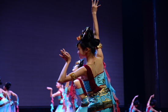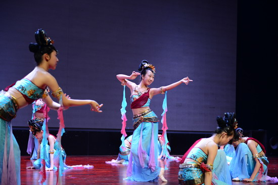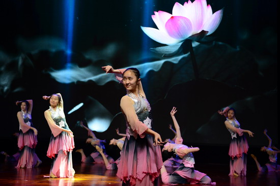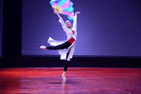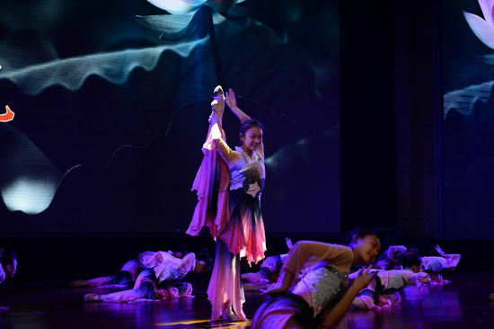 伴着一声响亮的“老师好!”巴蜀中学舞蹈团的同学们带着自信的微笑,足尖轻点,裙袂飞扬,从地面基训组合开始到个人技巧组合展示,让我们看到了一个基本功扎实训练有素的舞蹈团队。接下来是舞蹈交流环节,巴蜀中学舞蹈团献上李诗雨独舞《也许是要飞翔》、王婧涵独舞《扇舞丹青》、龙颖独舞《孔雀飞来》以及古典舞群舞《爱莲说》,北京理工附中同学展示了独舞《中国芭比》、《咏荷》,三人舞《回眸》,群舞《丝路随想》,北京翠微小学的独舞《这山那水》、群舞《草原上的其其格》。 我校女孩子们从单双三舞蹈到群舞剧目,充分展现了巴蜀舞蹈团同学极高的艺术素养和 舞蹈技艺,展现出巴蜀学子的风范。 尤其是我校舞蹈团展示的本届报送教育部参演全国艺术展演的群舞《爱莲说》,摇弋多姿步步生莲,将莲之“出淤泥而不染,濯清涟而不妖”的卓越风姿尽现眼前,令台下的来访师生也禁不住啧啧称叹。同学们完全沉浸在舞蹈的世界中,在舞台上灯光下用优美的舞姿展现出舞蹈的动人魅力,为在场师生献上了一台高质量的舞蹈盛宴。