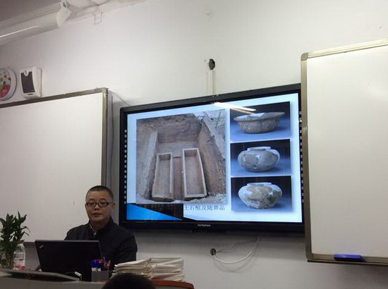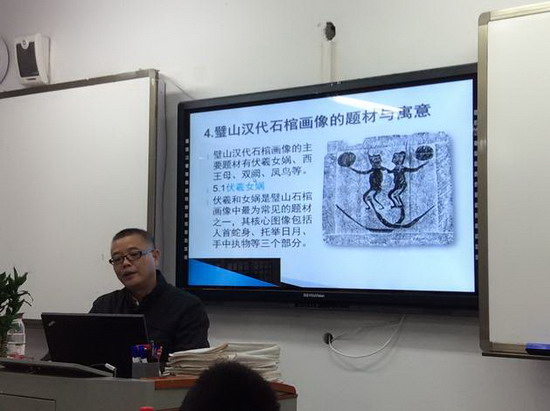 李大地老师是璧山人,对璧山有着深厚的感情,他首先向同学们介绍了璧山的历史沿革与古代文化,然后又通过大量详实的资料和图片向同学们详细介绍了璧山境内出土的汉代画像石棺的时代背景,发现过程以及分布情况,接着又给同学们讲解石棺画像的题材和寓意,教同学们识别哪个人物是伏羲,哪个人物是女娲,其间李老师还顺便介绍了当年他亲自参与考古发掘三峡博物馆镇馆之宝乌杨阙的奇闻轶事,令同学们赞叹不已。
