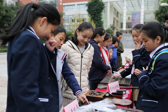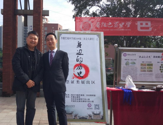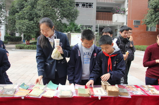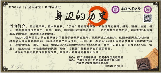 2016年11月10日,在鲁能巴蜀中学景观大道,初2019届《社会大课堂》之“身边的历史”主题活动展开启了大幕。初一的孩子们带来了他们家里曾经用过的老物件、旧钱币等共计两千余件,在历史老师的指导下分为钱币、票证、书籍、徽章和生活用品等五大类进行展出。