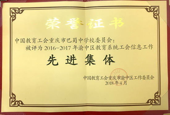 我校荣获2016-2017年渝中区教育系统工会信息先进集体,程睿同志获渝中区教育系统工会积极分子。