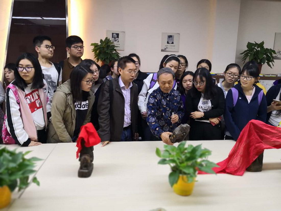 高2019届1班学生参观藏品,;聆听祝先生对藏品的介绍