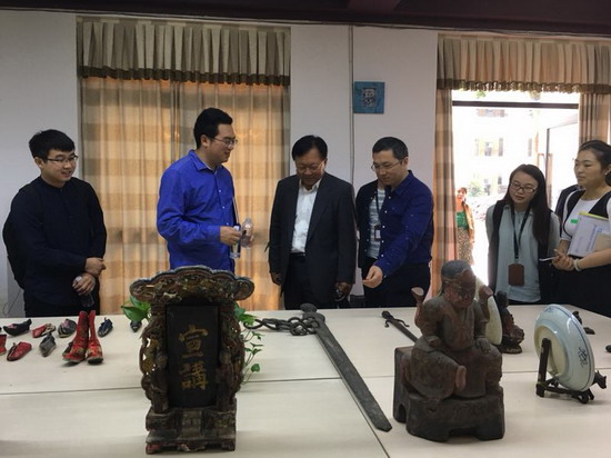 祝先生在向同学们和重庆市历史教研员黄开红老师介绍藏品