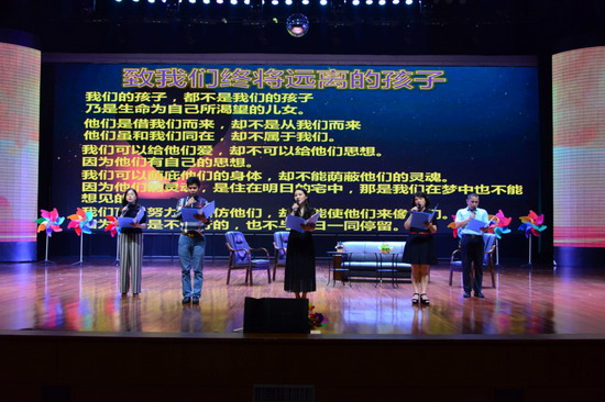 最后,在歌曲《在未来》的音乐声中,全体班主任和各班家委会代表高举五彩风车登台,共同祝福孩子们的学习一帆风顺,合力助力孩子们的五彩人生。
